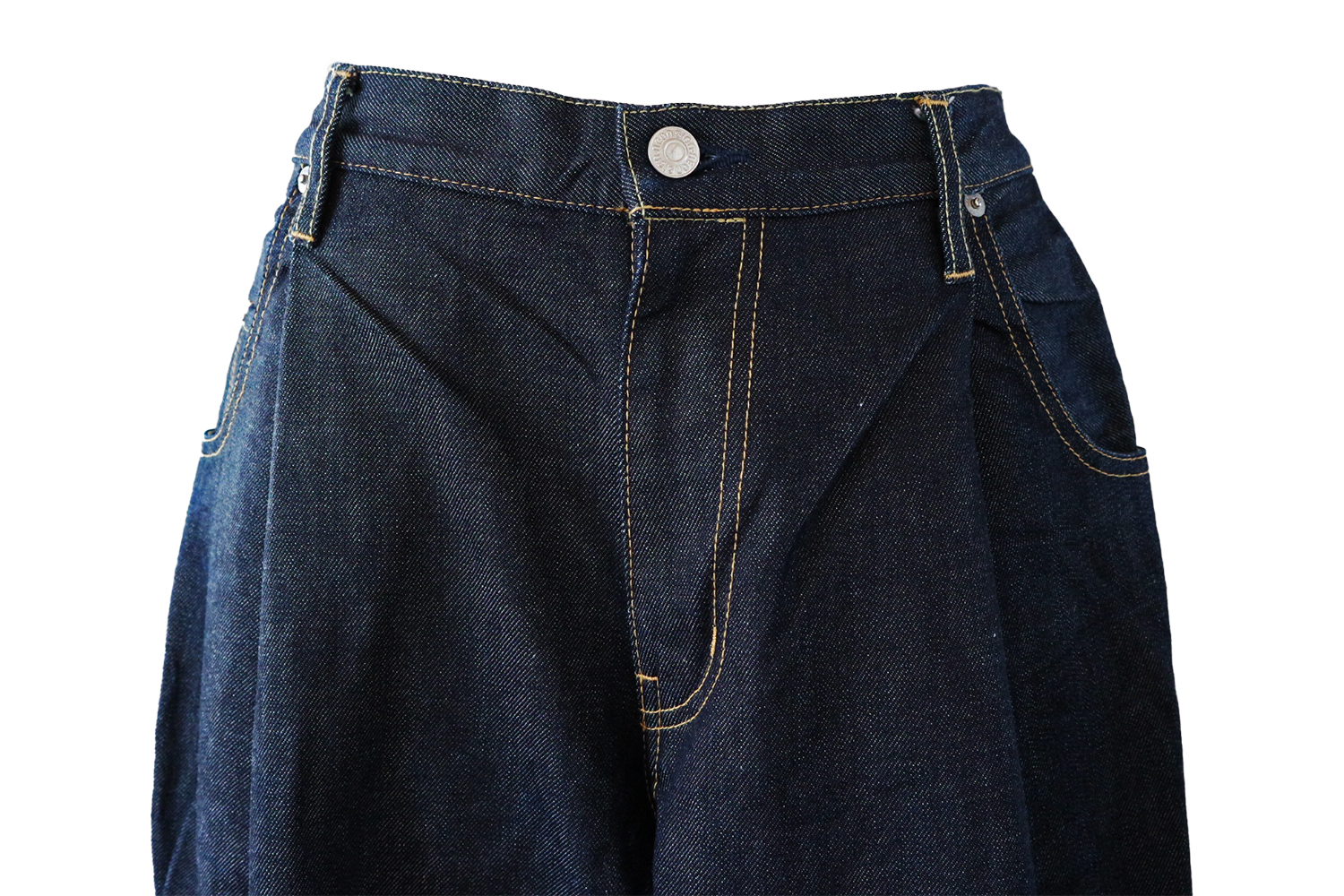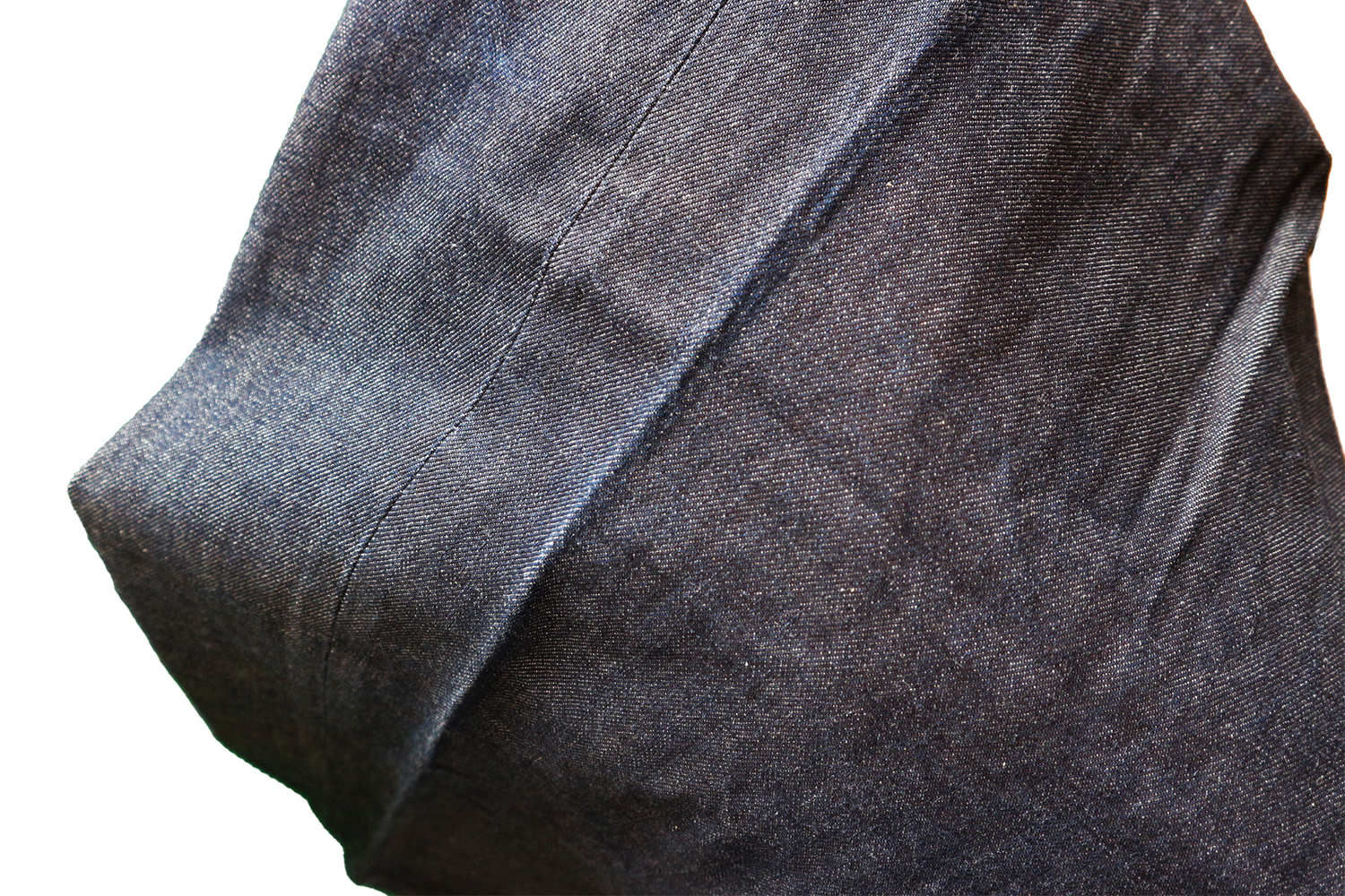 このデニムは本来、フロントに大きく入ったタックからセンタープレス的に線が入ってるはず。